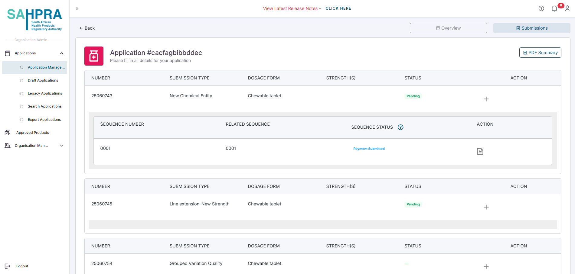 You can view the submissions and sequences of your application on the Submissions page Here you can use the action buttons next to each submission or sequence: