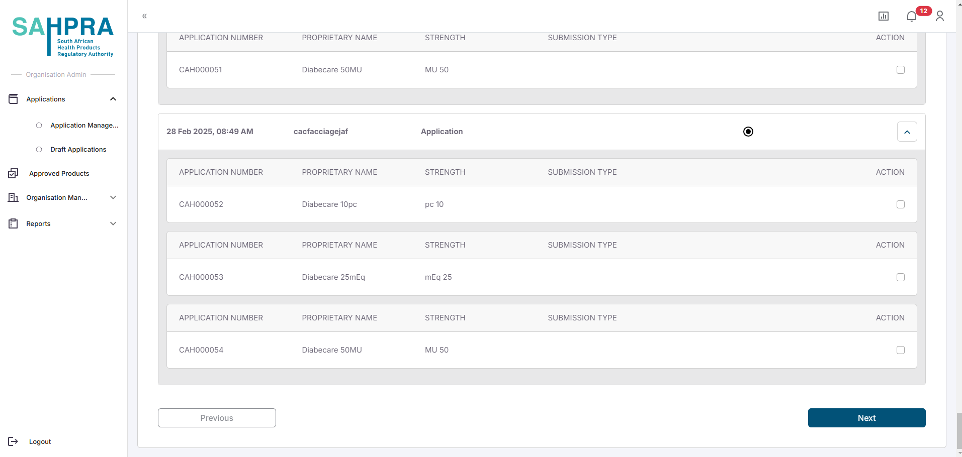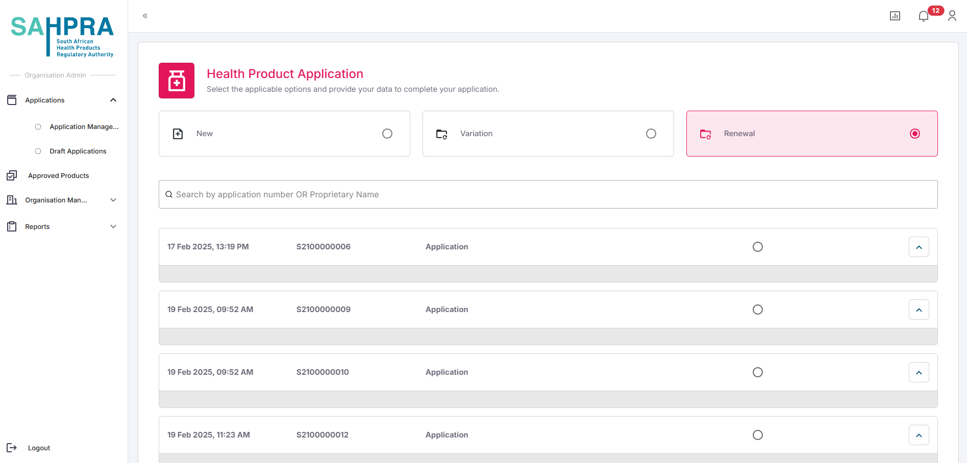 - Select an application which you wish to renew by clicking on the radio button next to the application. You can also search via the search bar for any details of an application. Note an entire application must be renewed and strengths within an application cannot be selected. If you wish to delink a strength from an application a variation “Delink Application Number (New Application ID Creation)” can be initiated.