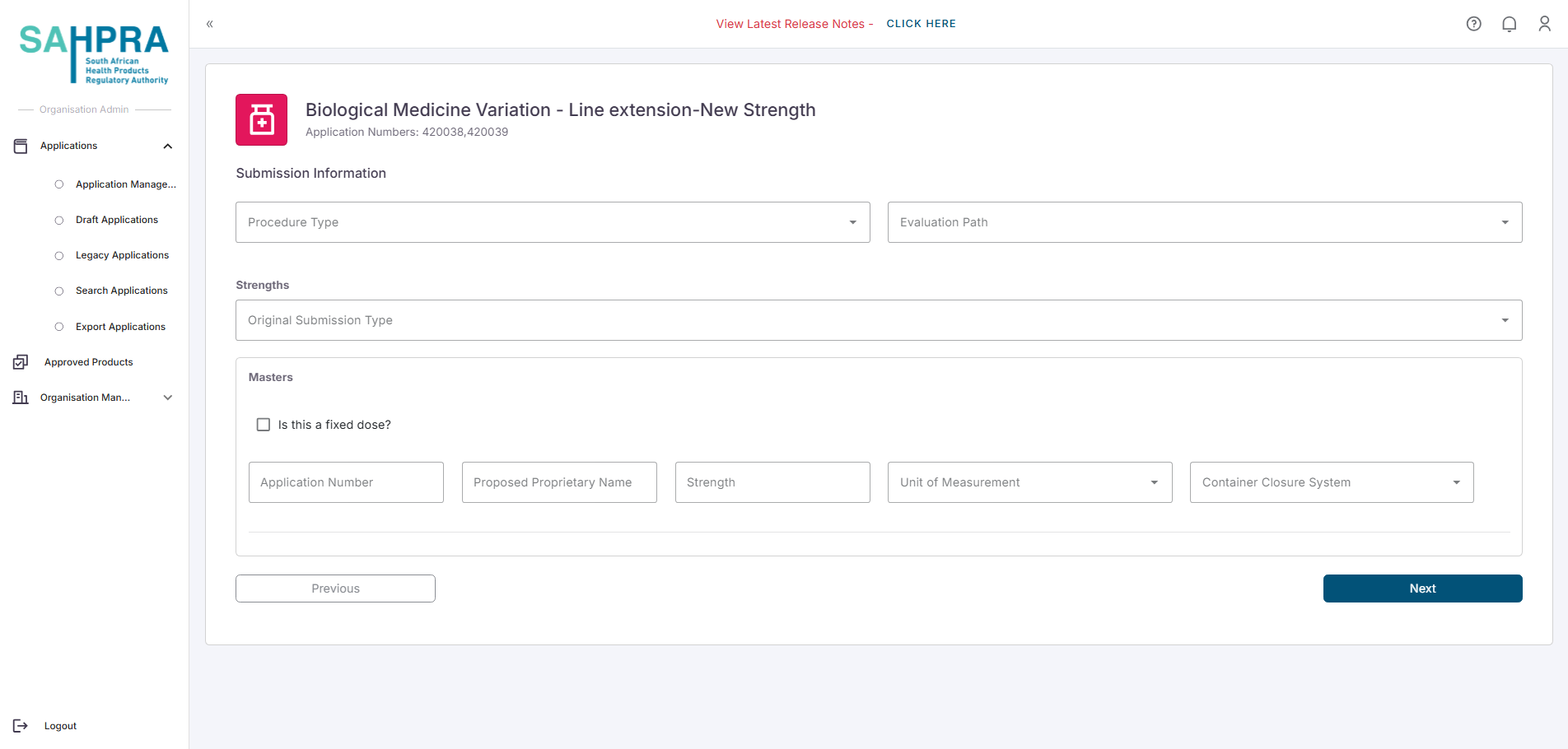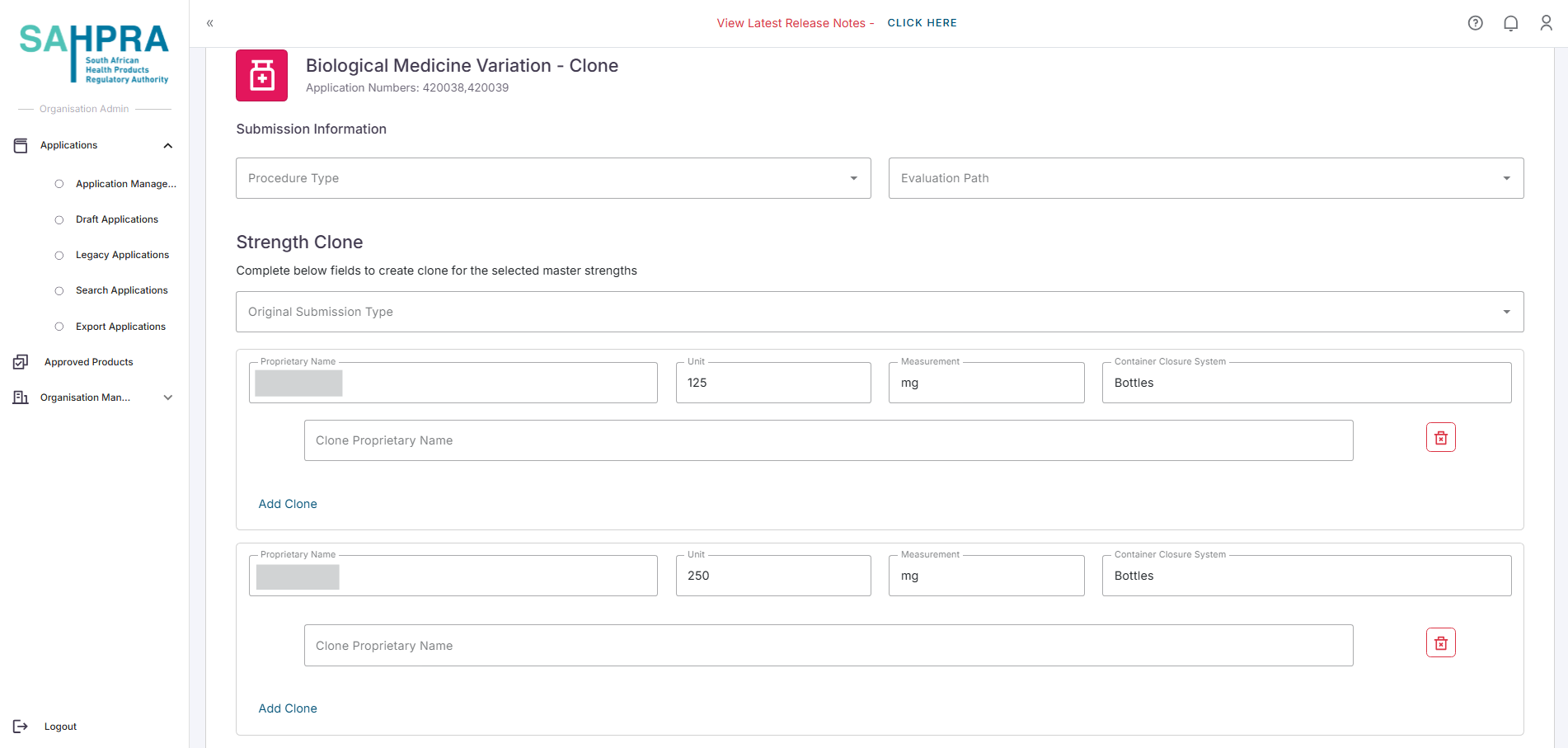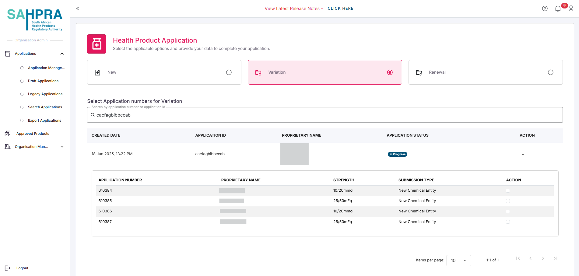 Once the variation submission has been reviewed and approved, the selected strength will be unlinked from the application and a new application ID will be created.
