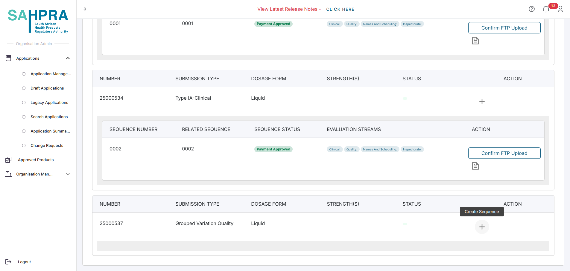 Once the sequence is submitted to the FTP server by clicking on Confirm FTP Upload, the application will move to the selected Organisation, and the Type II-Change in Applicant-Acquiring Submission will be created automatically.