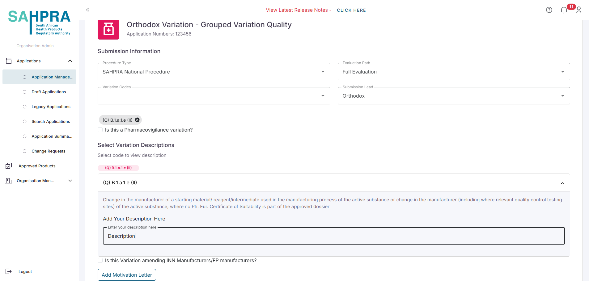 - You can also indicate if the variation is amending INN Manufacturers/FP manufacturers by checking the “Is this Variation amending INN Manufacturers/FP manufacturers?” checkbox.